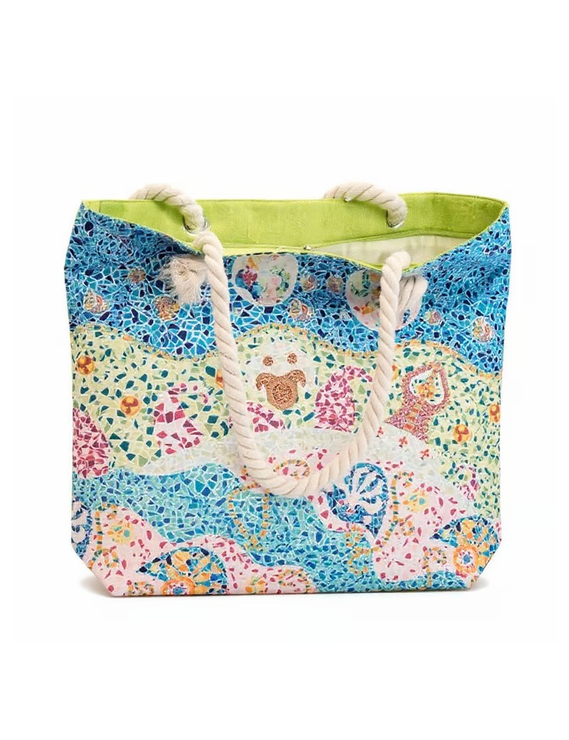 Bossa de platja amb un disseny inspirat en el Trencadís de Gaudí. Part frontal amb estampat tipus mosaic i part posterior llisa de color festuc. Tancament amb cremallera i nanses de corda per a un estil fresc i funcional.