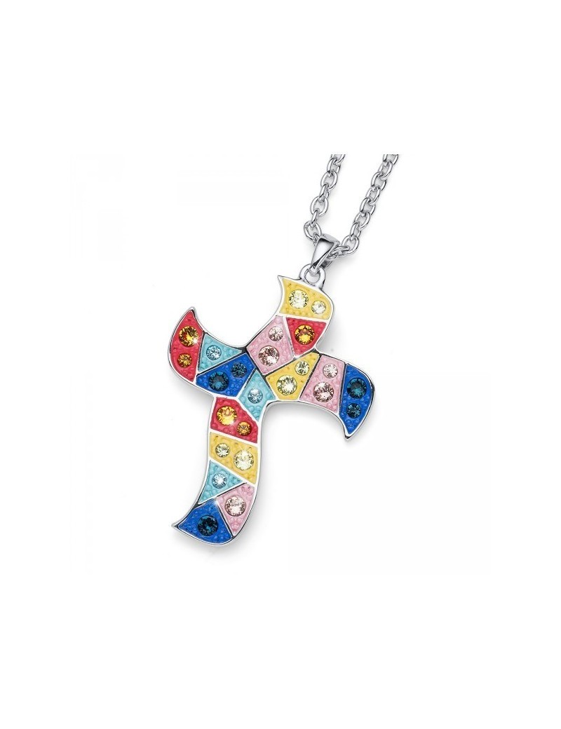 Penjoll model Gaudí Creu, chapat en rodi amb cristalls multicolors, tancament de seguretat, material anti al·lèrgic, no conté níquel.