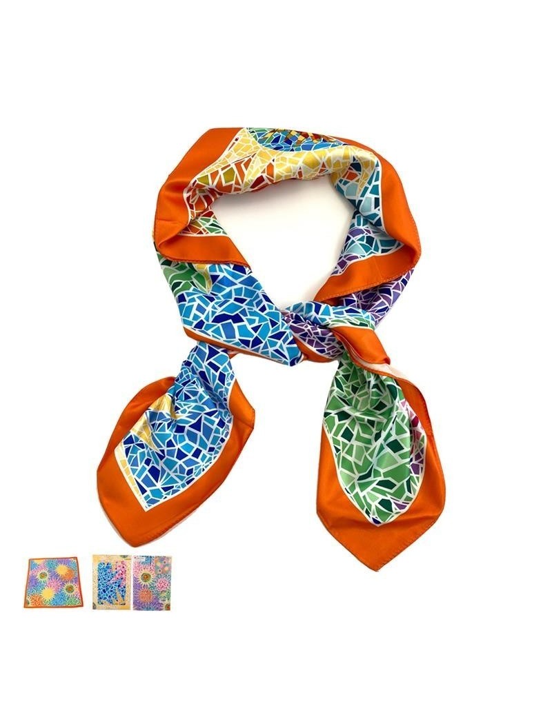 Mocador estampat d'alta qualitat, teixit 100% polièster amb acabat sedós. Suau i còmode. Decorat amb el disseny Trencadís de Gaudí.