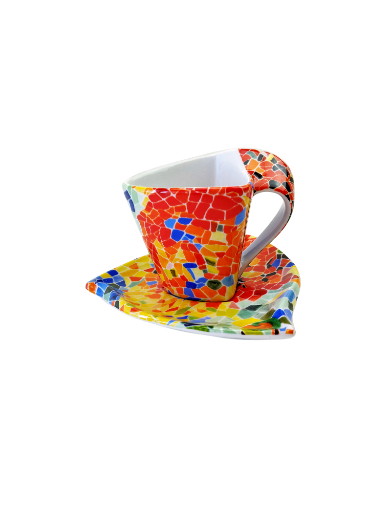 Tassa amb platet de ceràmica, amb un disseny exclusiu inspirat en l'obra de Gaudí.