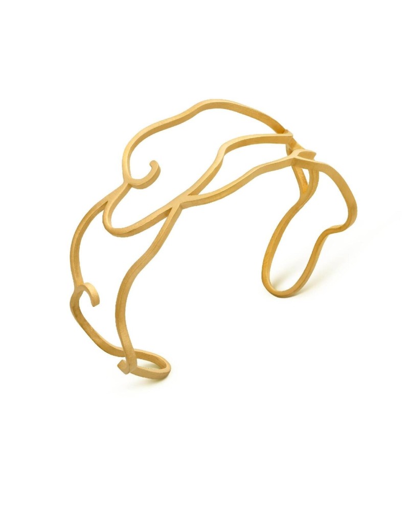 Polsera de formes irregulars de tires en metall mat daurat amb bany d'or de 24 K, inspirada en els motius naturals que hi ha dins de La Pedrera, obra modernista, de l'any 1906 - 1910, de l'arquitecte Antoni Gaudí. Dissenyada per Joidart.