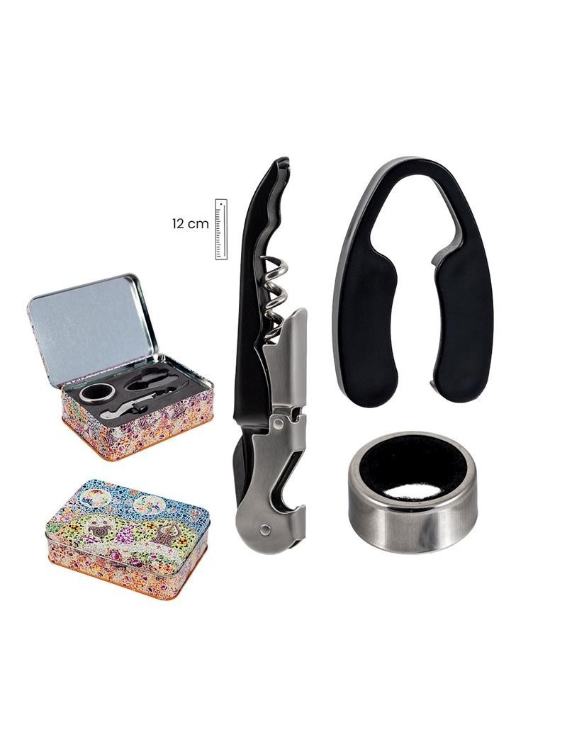 Wine set with bottle opener, anti-drip ring and bottle cap cutter. In a tin box with a colorful design inspired by the decorative elements of the architect Antoni Gaudí.