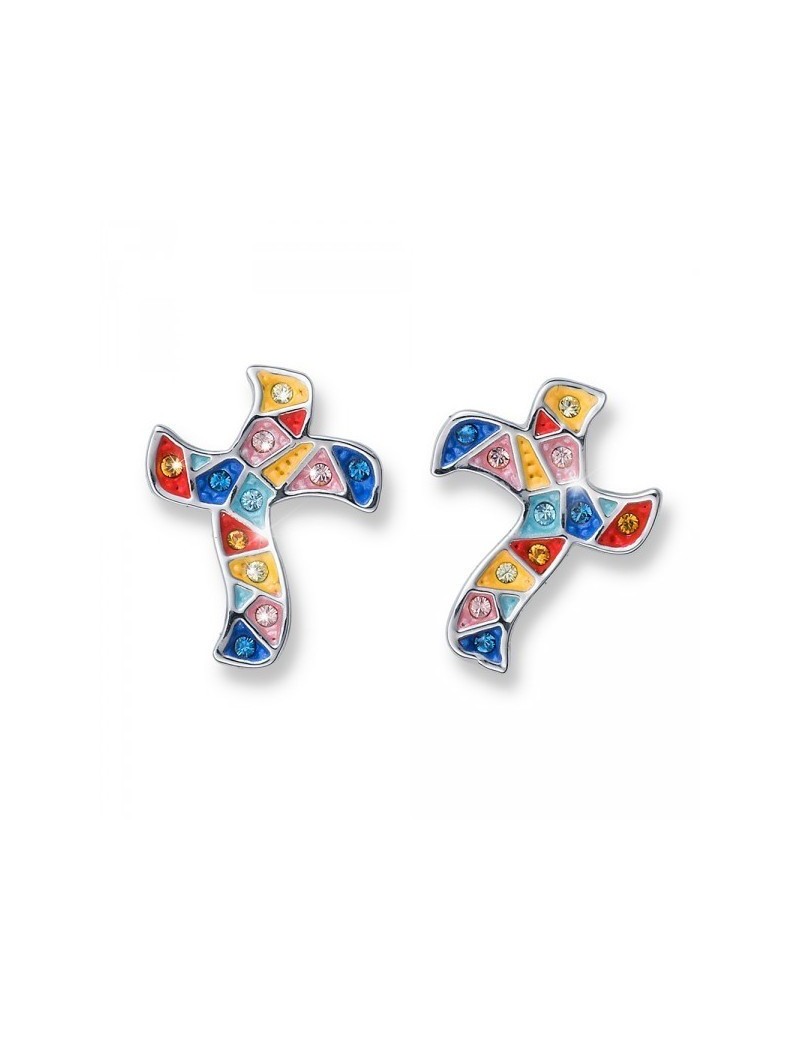 Gaudí Cross stud earrings made of rhodium plated metal, encrusted with multicoloured crystals.