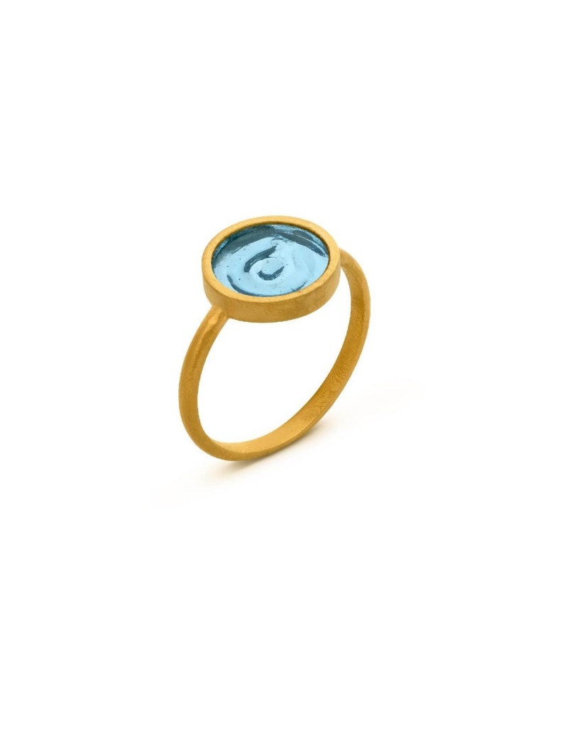 Ring in 24 K gold-plated matte gold metal with round motif of handcrafted Murano glass, with an intense blue color that gives a touch of color to the jewel.. Design by Joidart, inspired by the glass of the Casa Batlló, work of the architect Antoni Gaudí, from 1904 - 1906.
