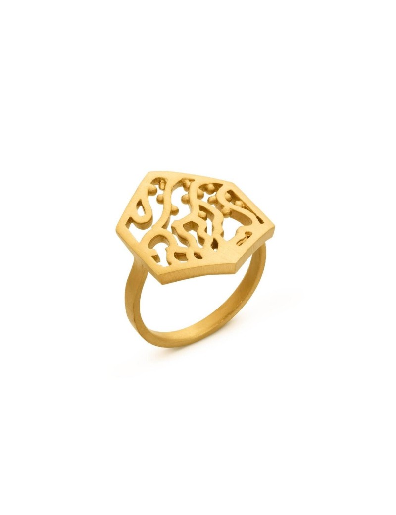 Anillo con motivo hexagonal con dibujo calado en metal mate dorado con baño de oro de 24 K, inspirado en el diseño de loseta del arquitecto Antoni Gaudí, en 1904. Diseñado por Joidart.