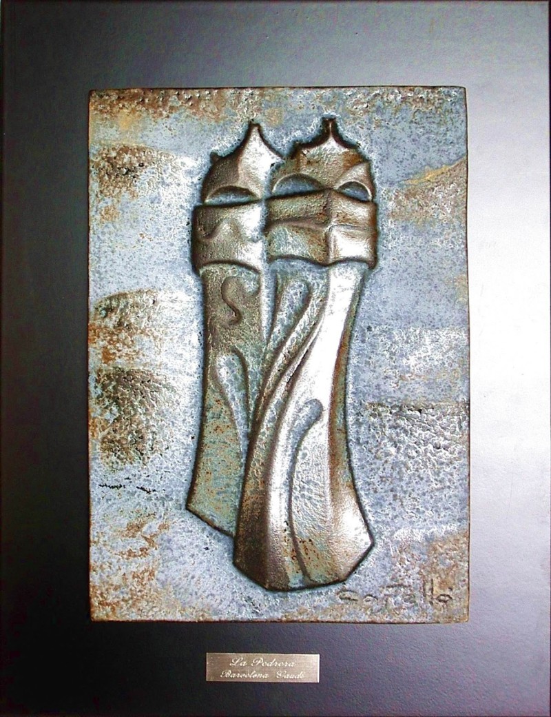 Cuadro inspirado en una de las chimeneas (también conocidas como guerreros) de La Pedrera, siguiendo un proceso de bajorelieve en cerámica, con aplicación de engobes y esmaltes de color. Decorado a mano.