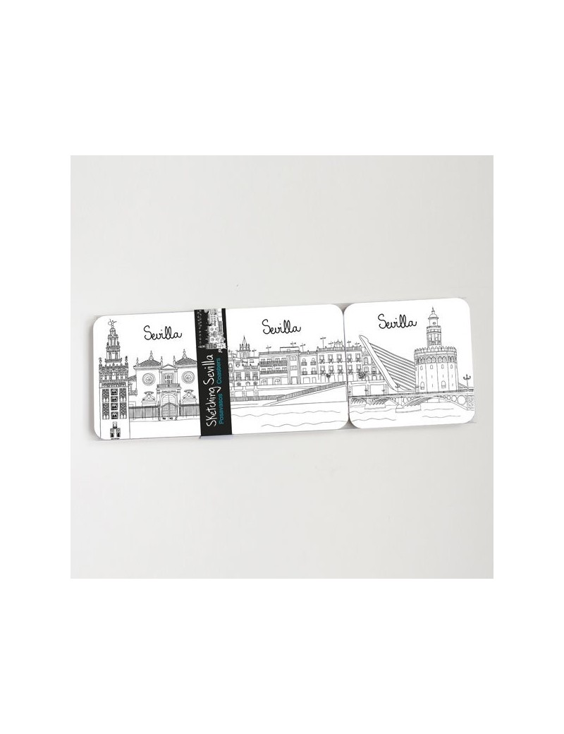 Elige en qué rincón de la ciudad poner tu vaso y tomarte algo, con este set de 6 Posavasos de la Colección Sketching Sevilla. Vienen en una caja de acetato transparente con todos los modelos desplegados. Medidas: ø9 cm.