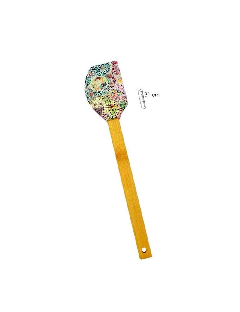 Spatule de cuisine en silicone et manche en bambou avec décoration inspirée des célèbres dessins d'Antoni Gaudí.