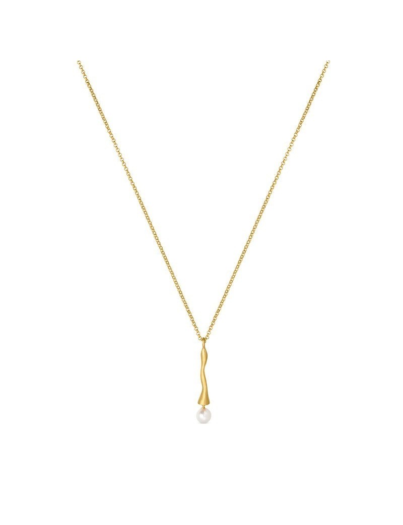 Collier avec pendentif allongé et chaîne. Réalisé en métal mat plaqué or 24 carats et une perle de verre de Murano au bout du pendentif. Inspiration tirée de la ville de Barcelone et de son sinueux quartier gothique.